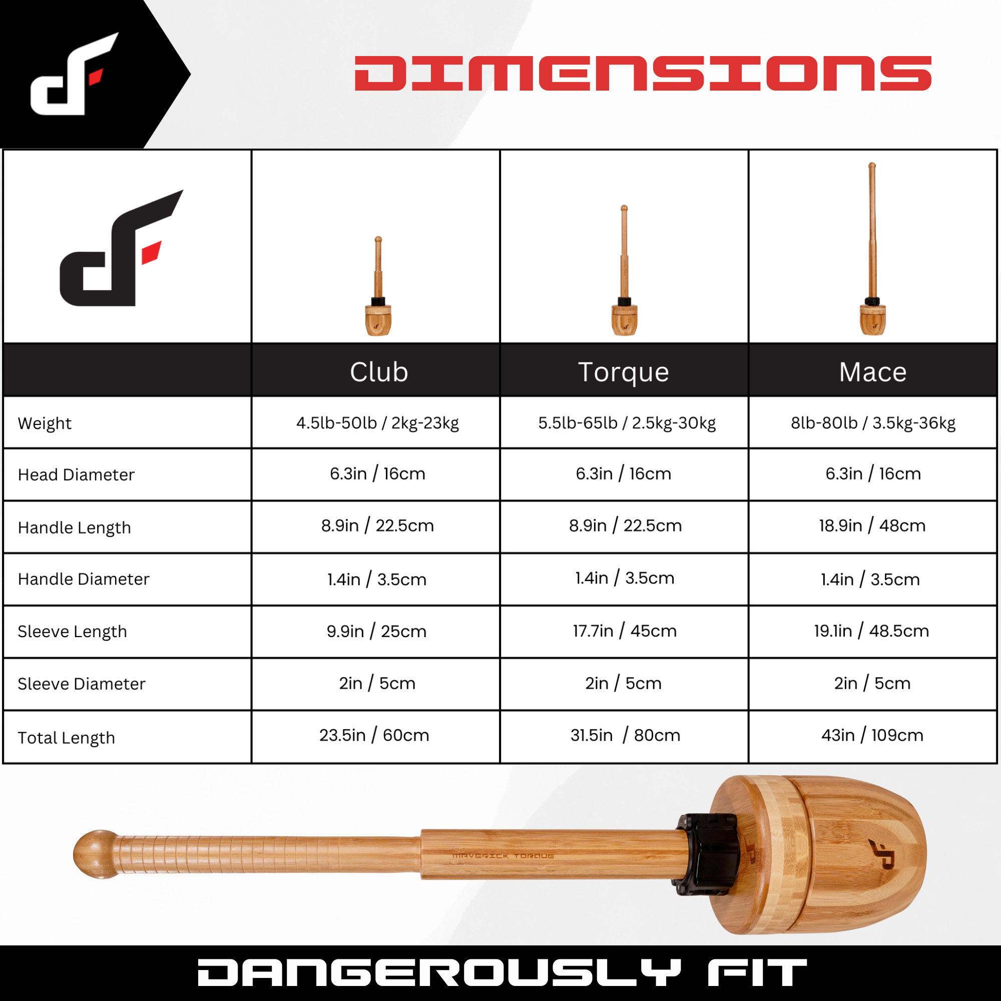| Features | Increasing the load is a fundamental element for developing strength. However, an optimal strength progression system is overlooked in most training programs. This is one of the reasons why many people hit plateaus in their strength gains. The Maverick Torque is the perfect micro loading training tool, simply add more weight plates to your mace as your skill improves and watch your strength gains explode. The Torque is the halfway length between the club and mace, making it more of a Bulava club (short mace/long club). It stands at 80cm tall and weighs just under 2.5kg empty, and can be loaded up to 27.5kg. The extra 20cm long handle adds additional leverage making it a little more challenging to control than the club. The Torque is suitable for single arm training and two handed movements. |