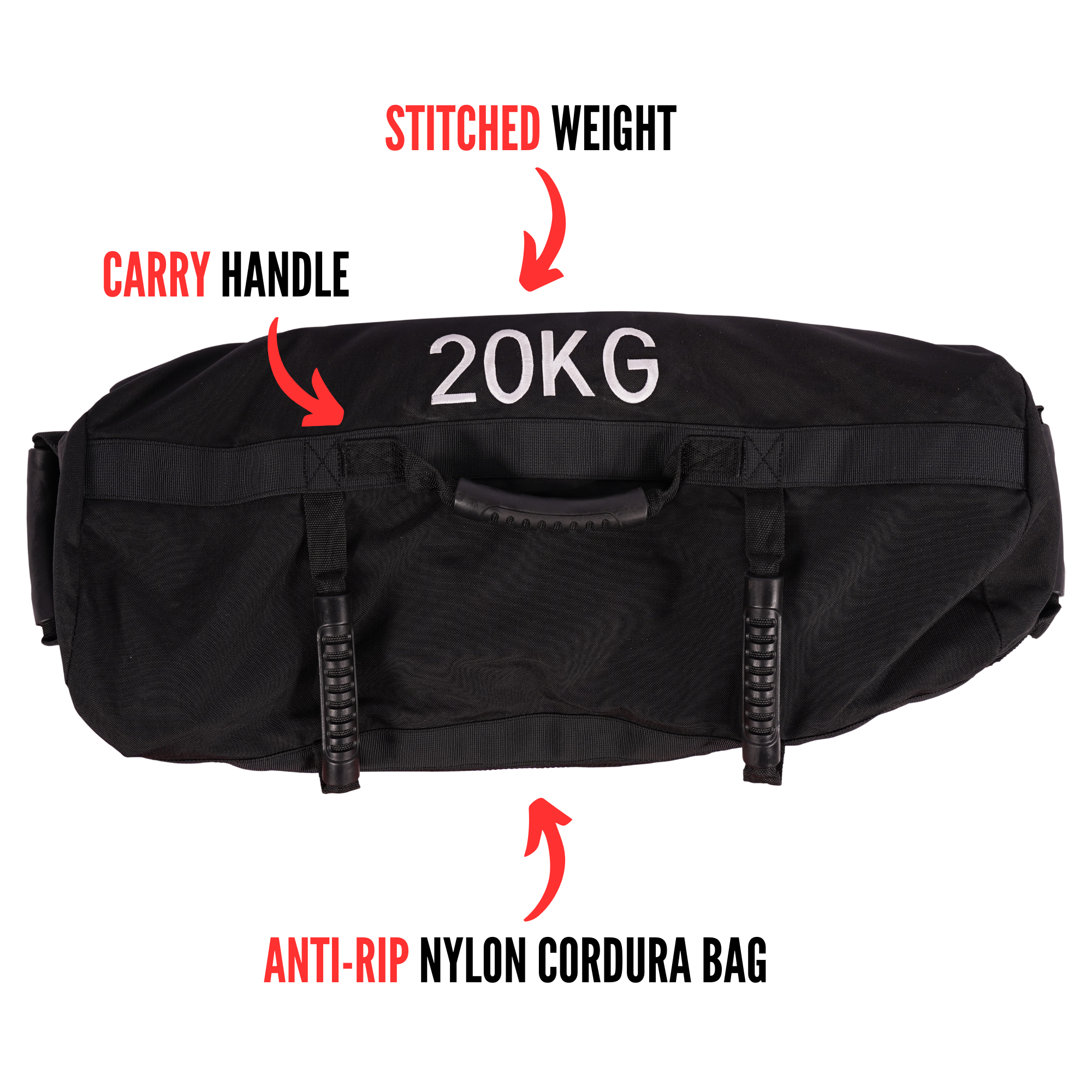 The sandbag is highly versatile with 7 reinforced lifting handles providing multiple grip positions giving you the option to push, pull, swing, carry and throw the bag in plethora of ways.